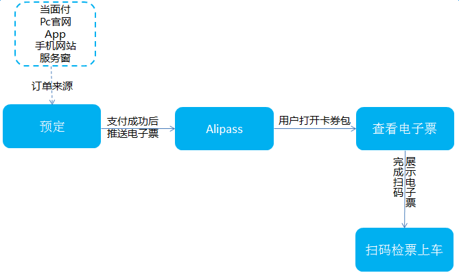 用户通过支付宝支付方式完成线上/线下购票后,客运站调用支付宝卡券产品推送电子票到用户支付宝钱包卡券包中,乘客无须去自助机取票,直接展示二维码在检票口扫码即可完成无纸化扫码上车。