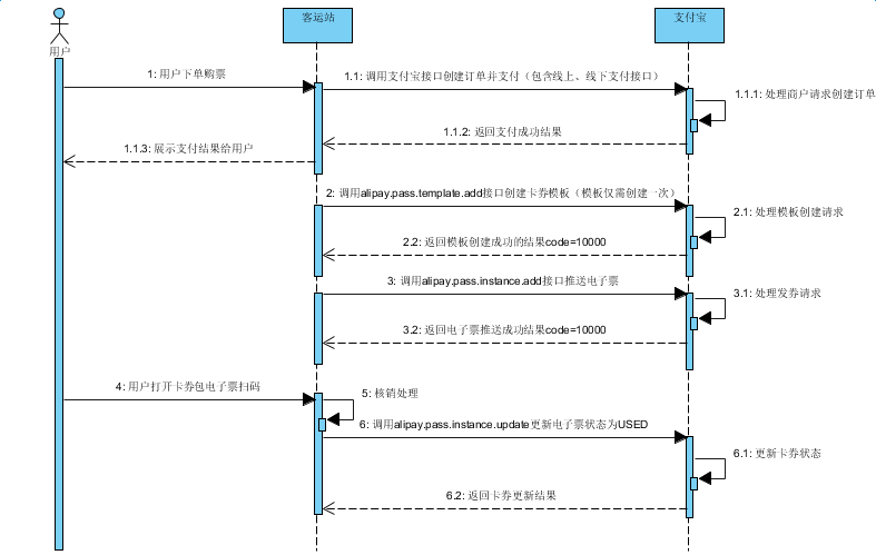 alipass共包含4个接口,模板创建接口alipay.pass.template.add仅需在最初调用一次用于创建模板,以后每次发送卡券都仅需调用alipay.pass.instance.add即可,当卡券状态发生变化时需调用alipay.pass.instance.update接口同步更新卡券状态。