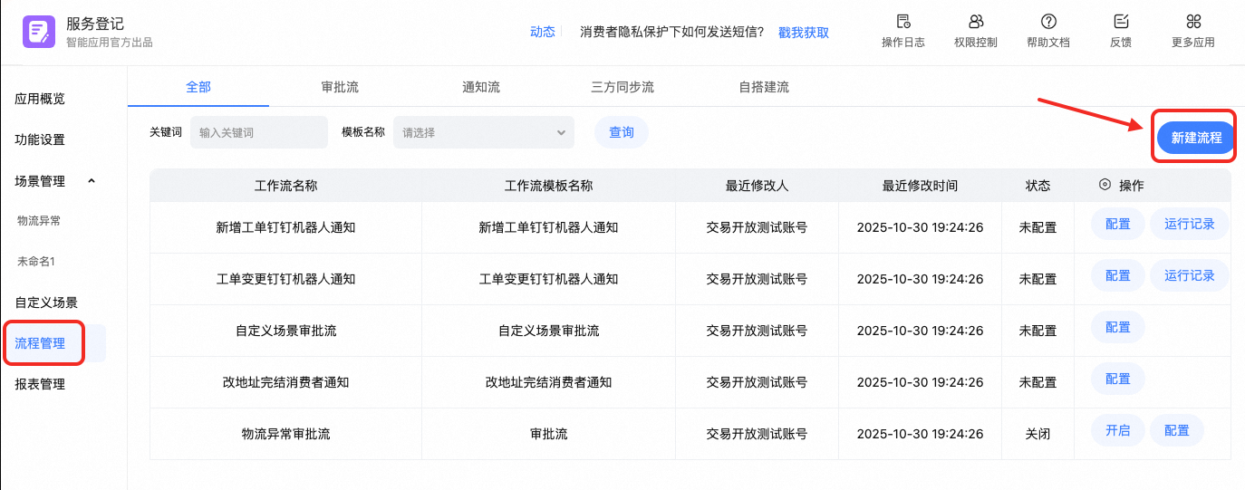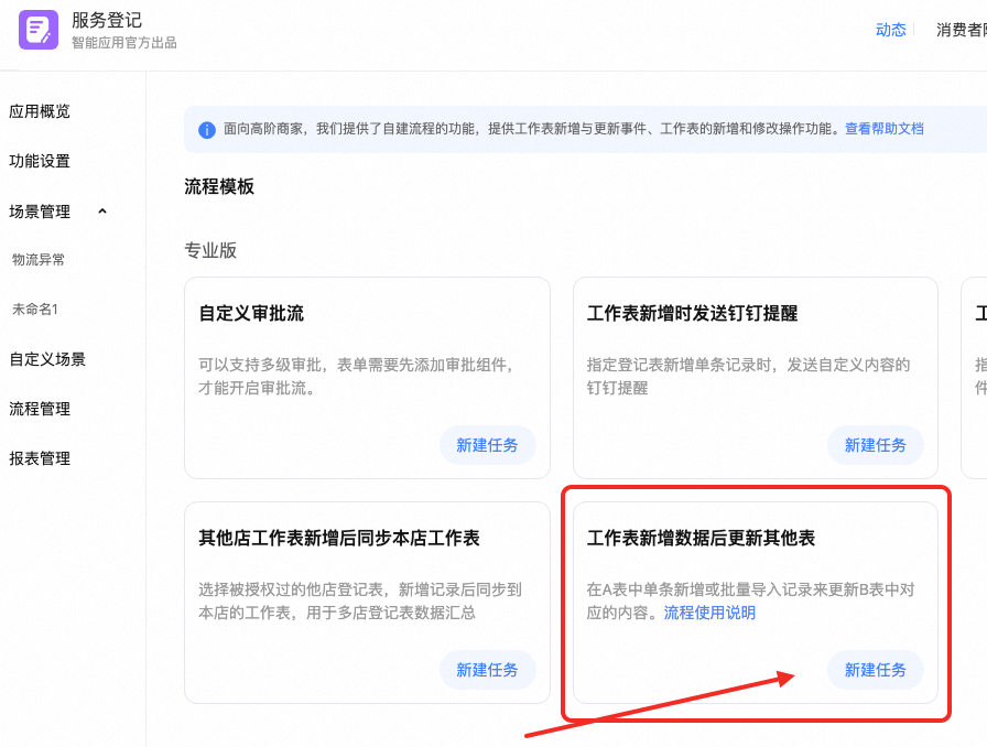 第三个节点,选择 应用:服务登记;执行动作:更新工作表单条记录。