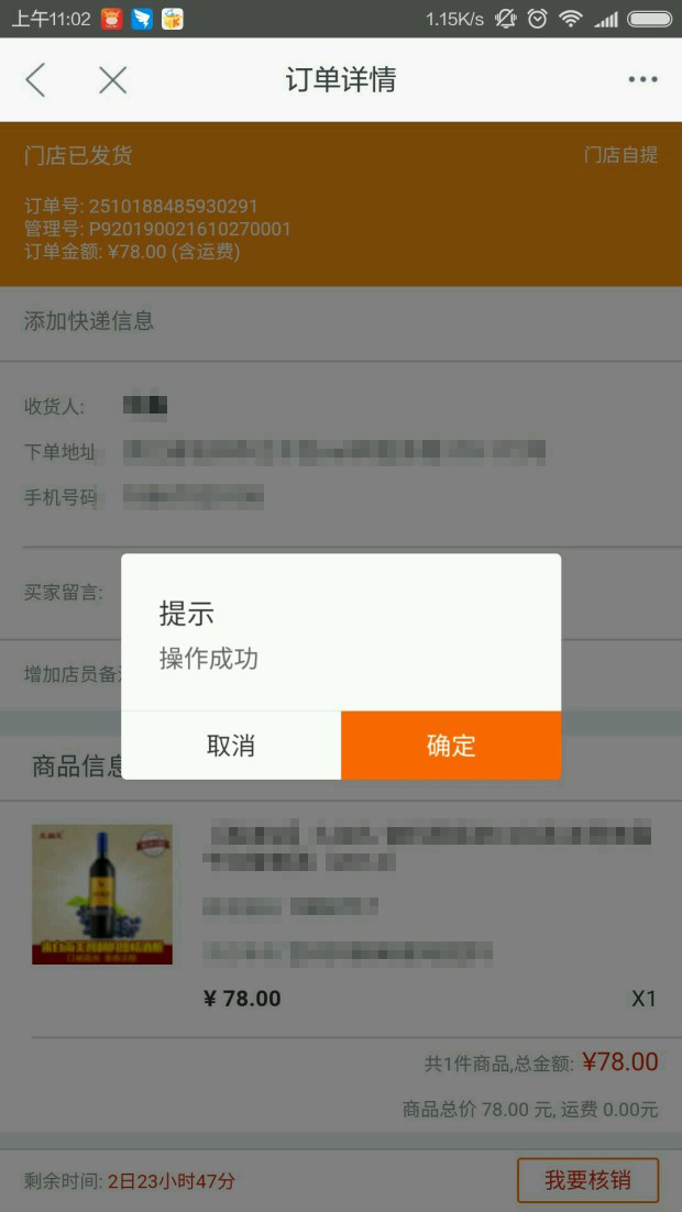 点击[我要核销]后,提示[操作成功],点击[确定]