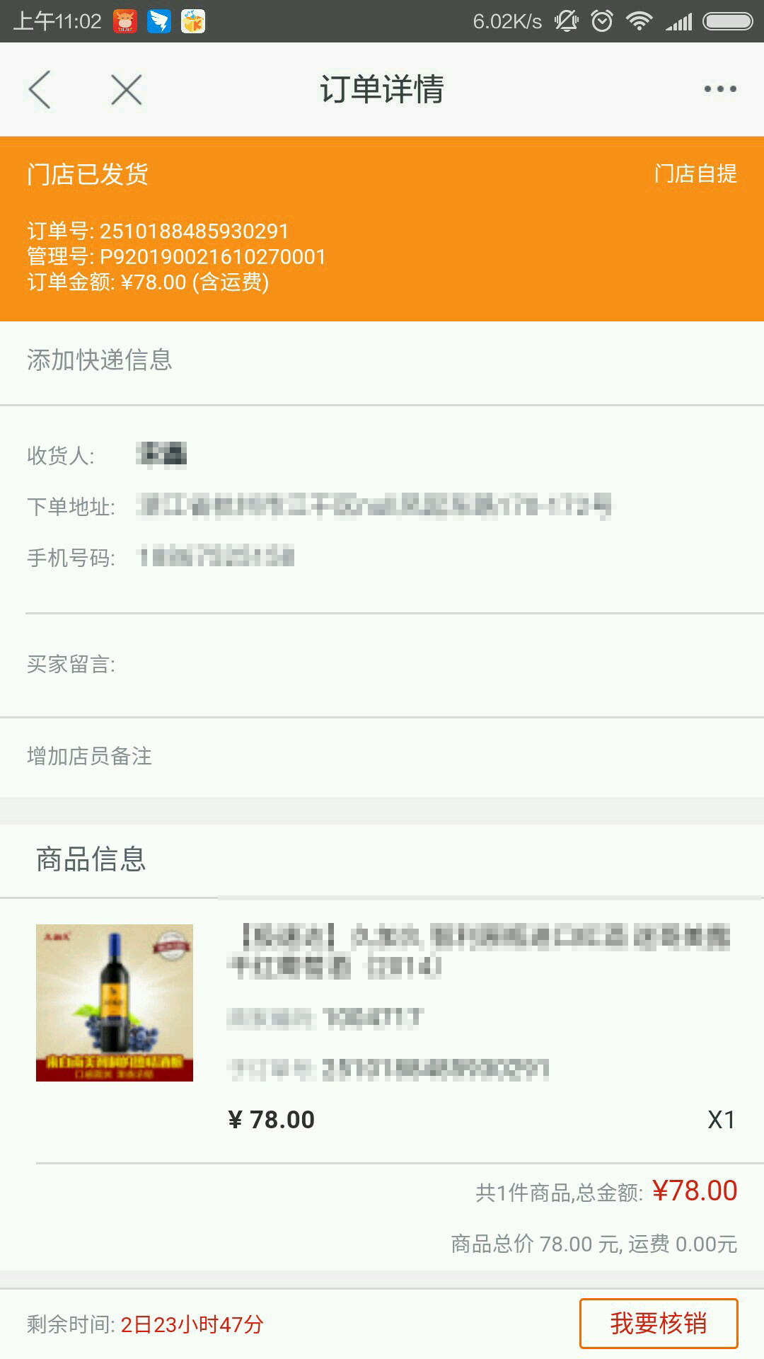 点击[验证]后,跳转到订单详情页,点击[我要核销]