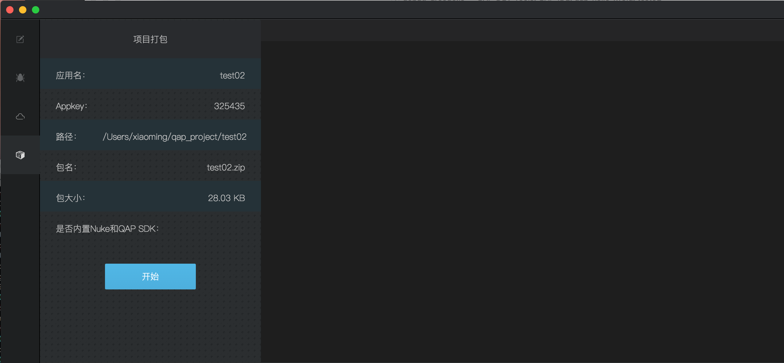点击左侧菜单栏的打包图标(从上到下第四个),开始打包:
