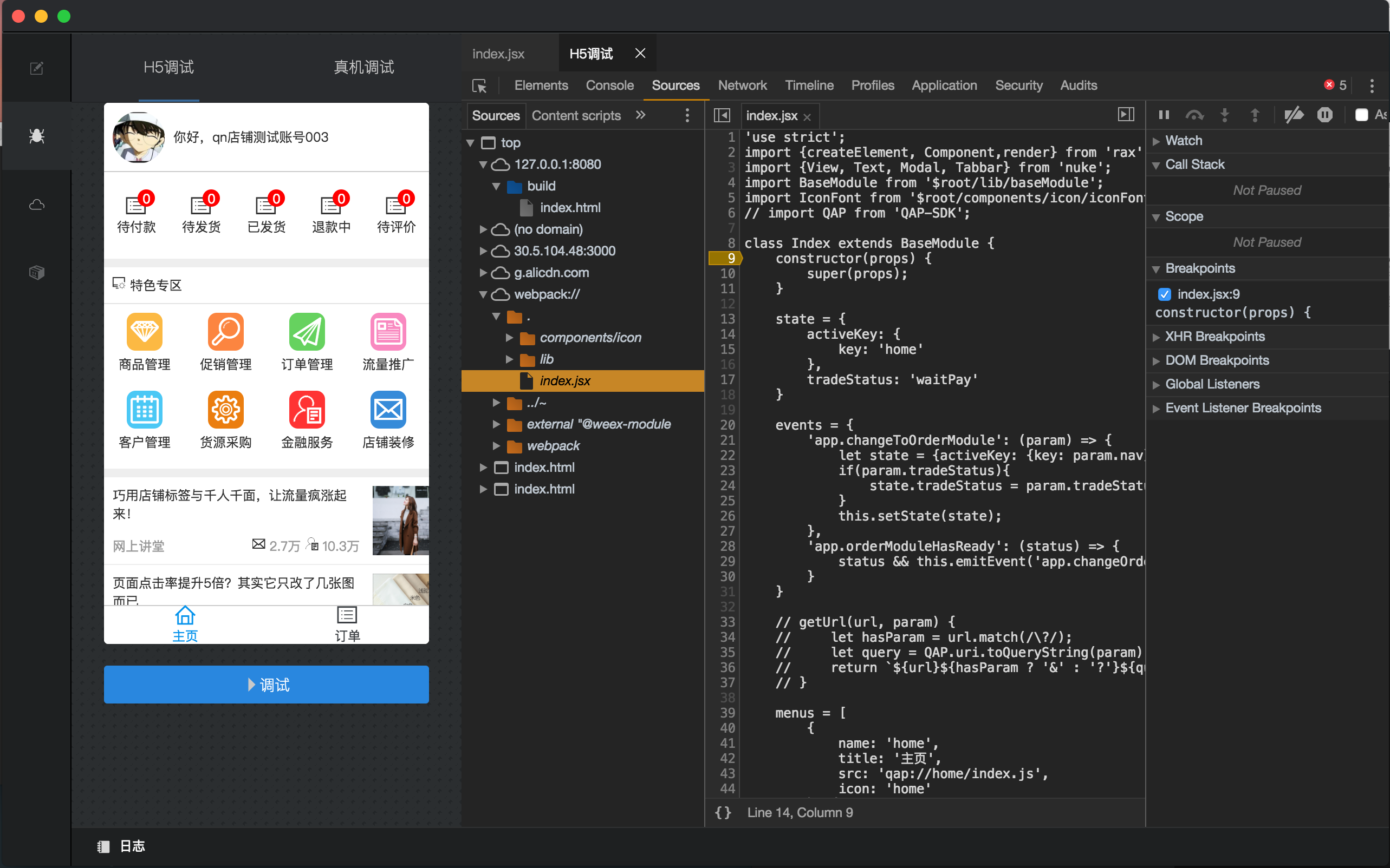 如上图所示,调试界面分为“H5调试”和“真机调试”区域。在H5预览区域,向下滚动后点击蓝色的“调试按钮”即可调试该页面的H5版本。源码调试,需点击展开webpack://标签。