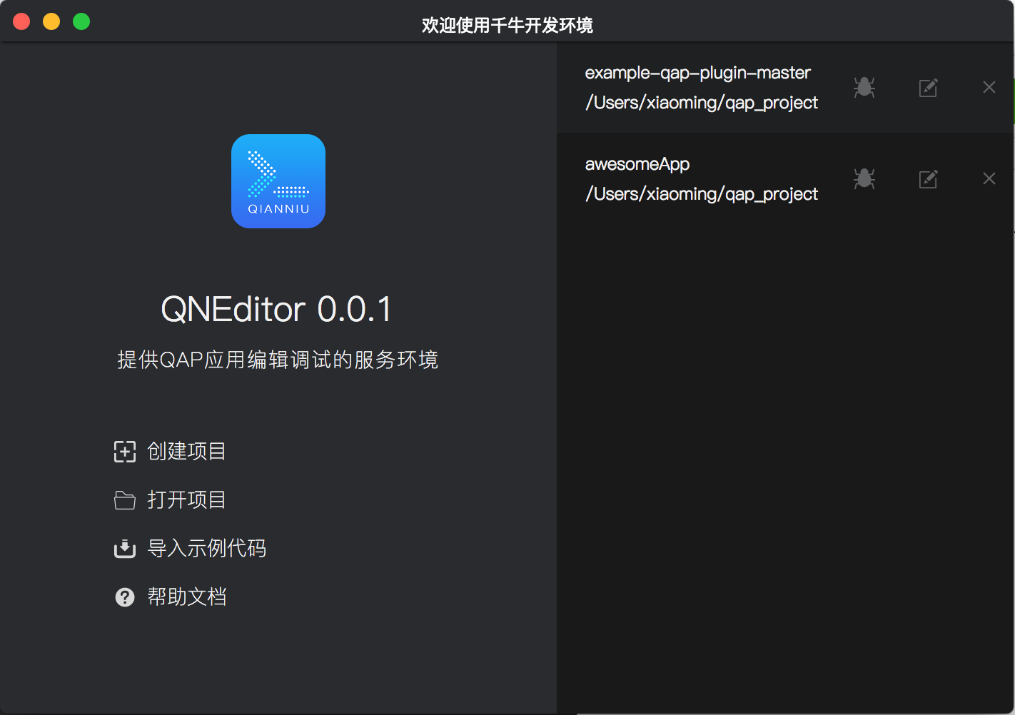 打开“千牛开发环境”应用程序,会展示工程列表(首次打开时为空)。