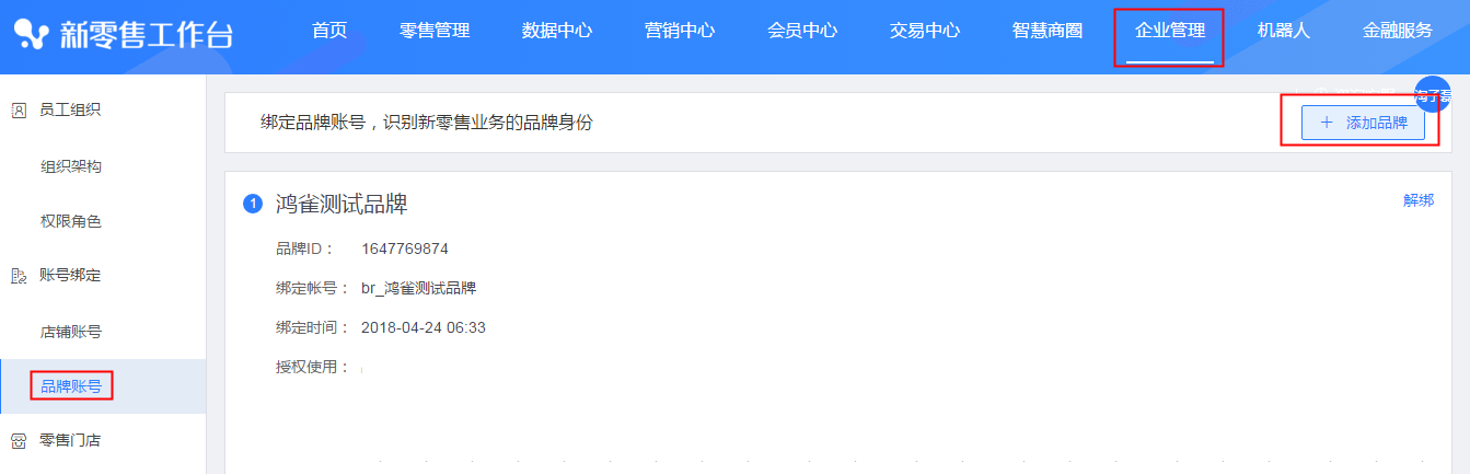 步骤1:在【新零售工作台 - 企业管理 - 品牌账号】中,点击“添加品牌”:
