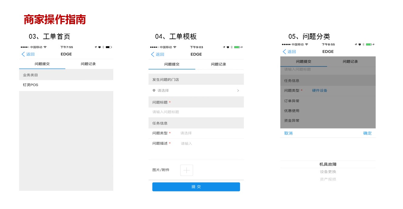 2、请根据实际问题,选择合适的"业务类目",并选择"发生问题的门店",填写"问题描述"、"联系方式",如有附件,可上传照片或视频。填写完毕后提交工单。请注意:工单请一定填写联系人、联系方式、如涉及订单问题,请填写订单号;如涉及机具硬件故障,请填写机具背面的SN编号(条形码编号)。如服务人员有不明事项,会主动与您电话联系