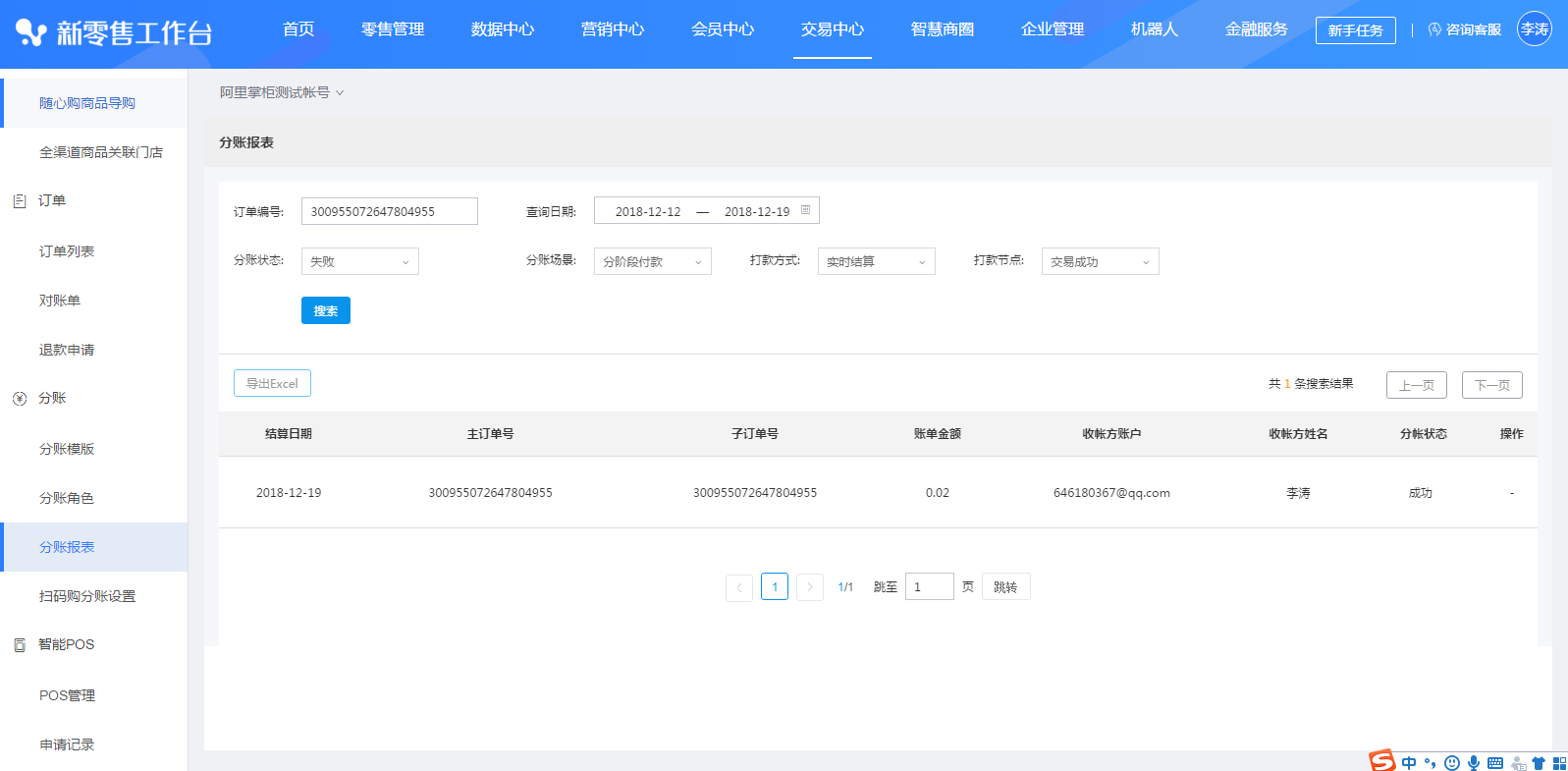 新零售工作台—业务设置—分账报表——找到需要分账的订单——手工补账
