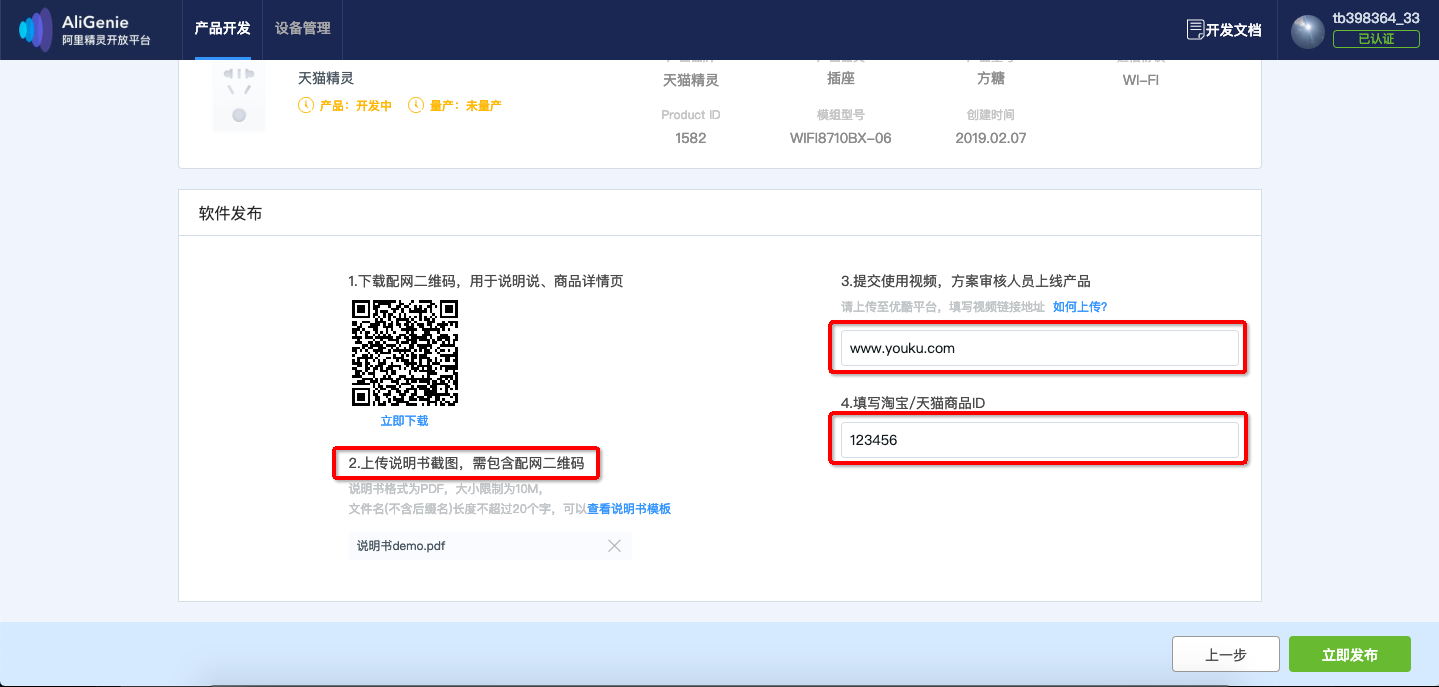 | 2 | 填写产品信息 | 必填 | 必填 | 必填 | |