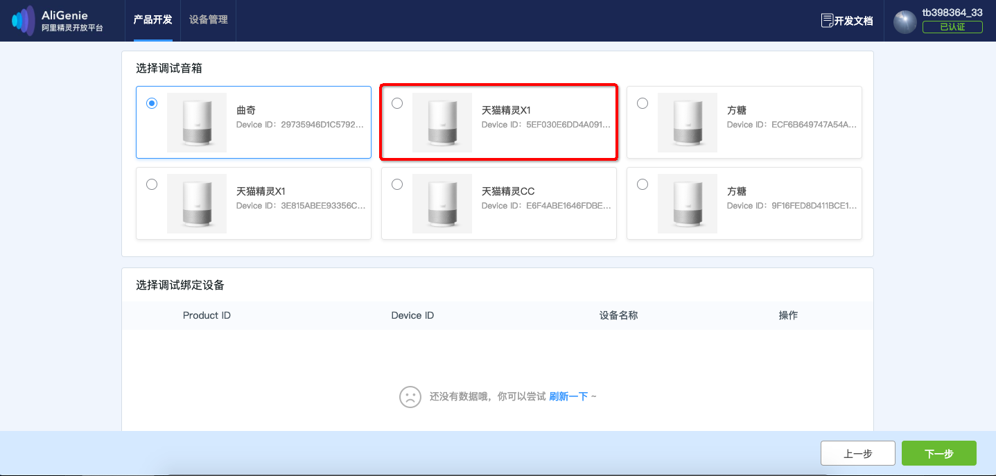 已配网后的IoT设备将出现在”选择调试绑定设备列表“中:
