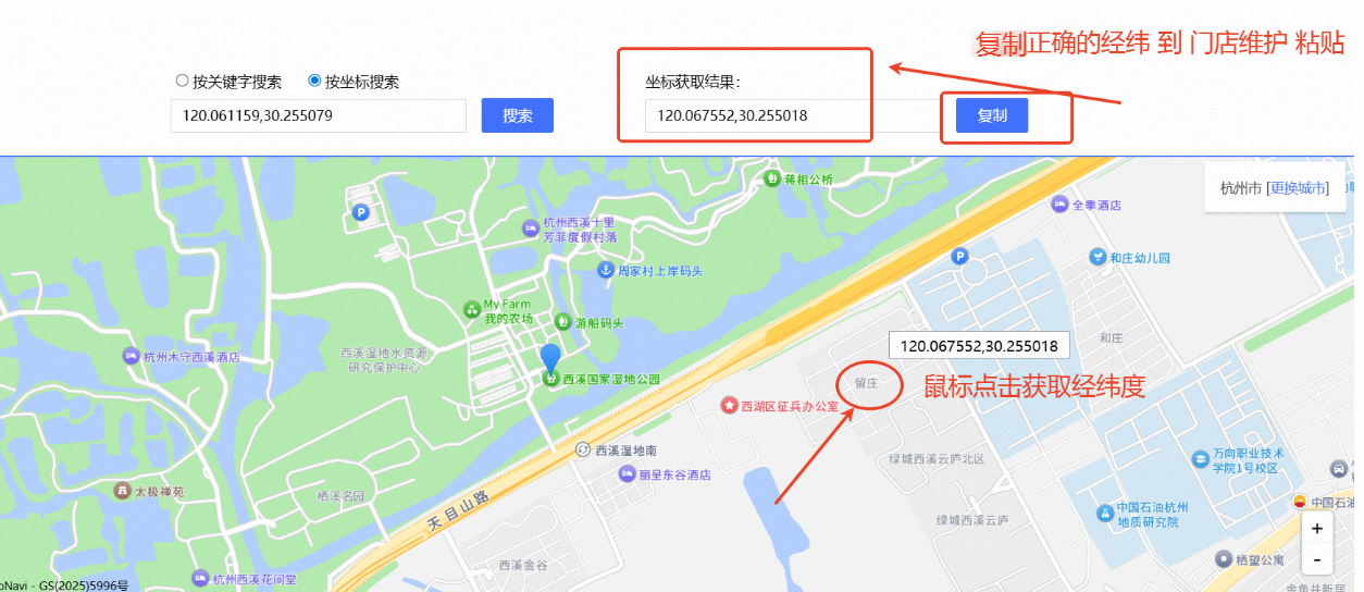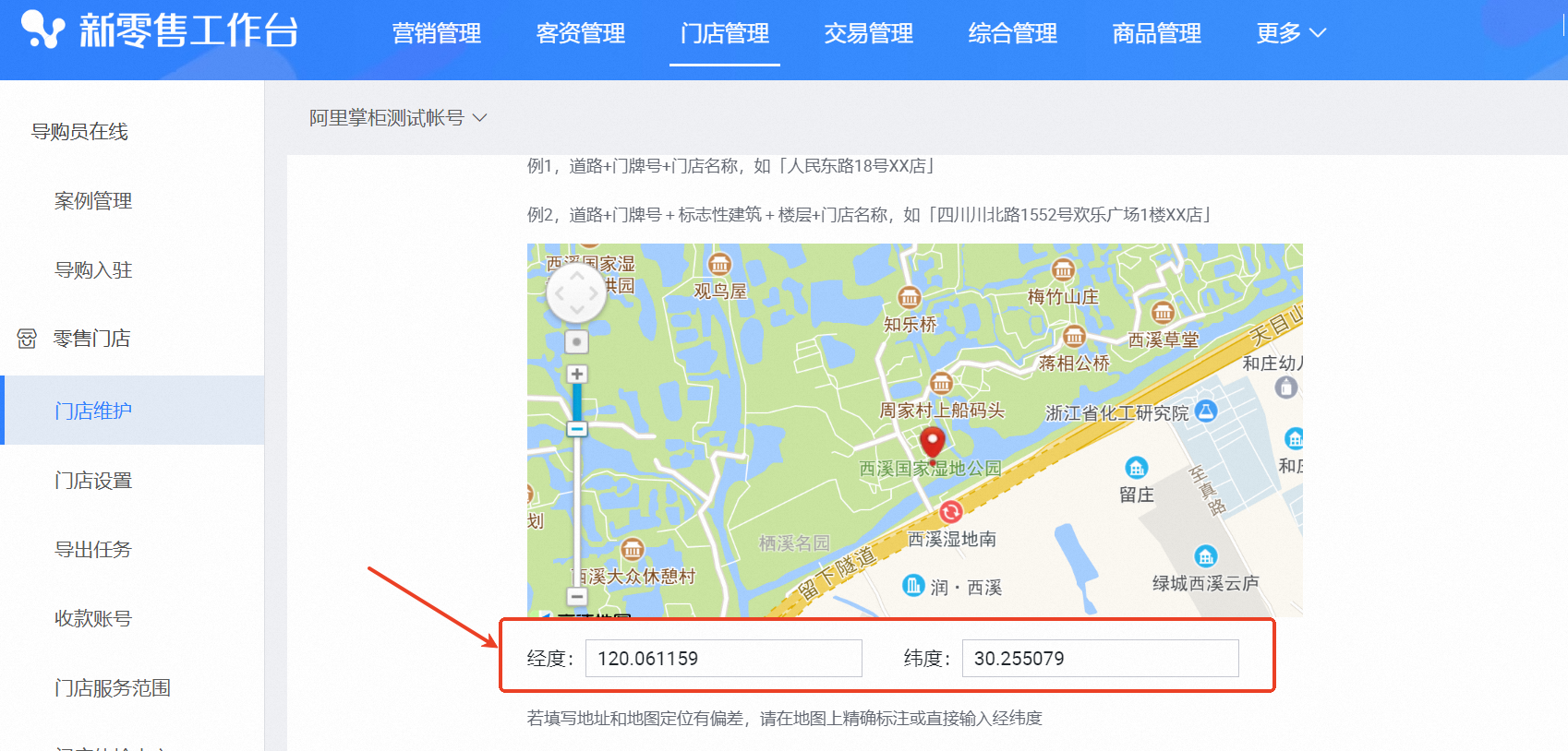 操作步骤:第一步:注册登录,才能显示 经纬度小数点 后面几位第二步:输入门店维护的经纬度,然后 用鼠标选点 并点击第三步:复制右上角选出来的经纬度,填写到 门店维护的经纬度里,提交